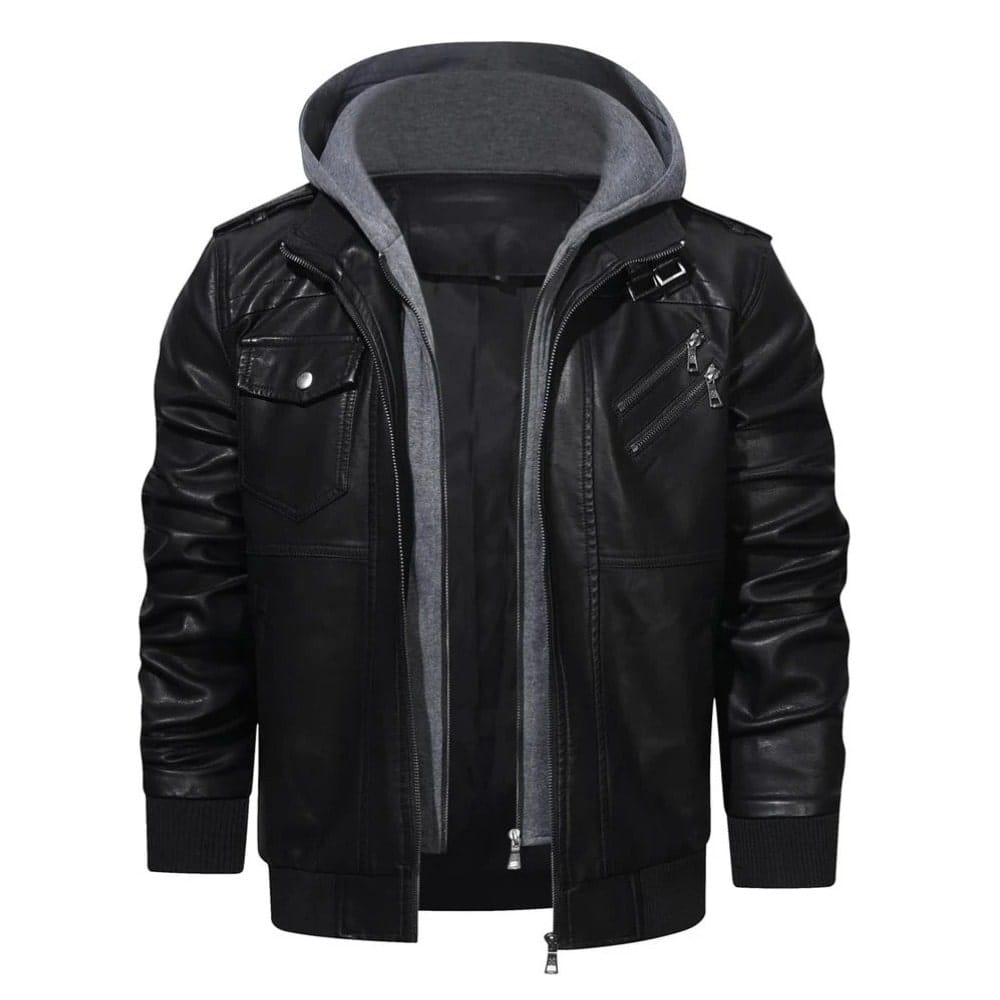 Men's Black Genuine Lambskin Leather Motorcycle Jacket with Detachable Hood