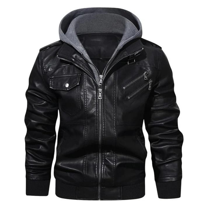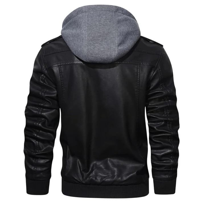 Designed for versatility, the jacket features a smooth polyester lining and a concealed front two zippered chest pocket on left side and one pocket on right side to carry essentials along with a smooth front zipper closure for easy wear. The detachable drawstring hood can easily be removed, transforming the piece into a classic stand-collar biker-style leather jacket—perfect for different looks and changing weather.
