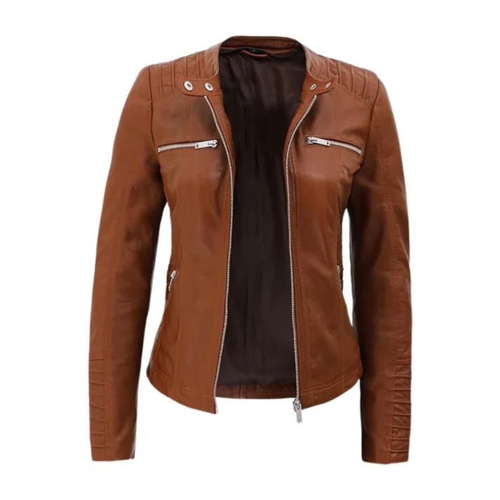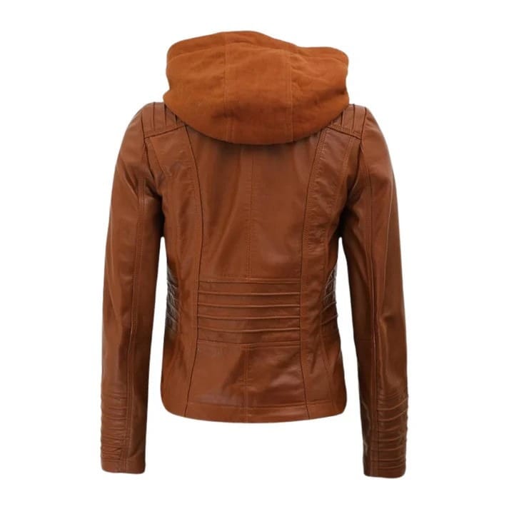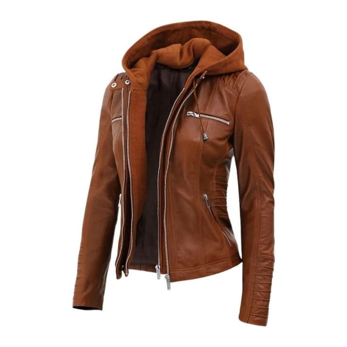 This women's leather jacket is crafted from 100% genuine leather and features a rich brown color with a structured silhouette. Designed for both style and functionality, it includes a removable hood, allowing for a versatile look that can be worn as a biker-style jacket or a more refined outer layer.